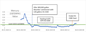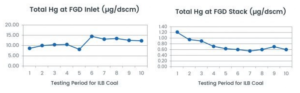 The graphs below represent influent and effluent Hg for a large, commercial WFGD treated with KLeeNscrub.